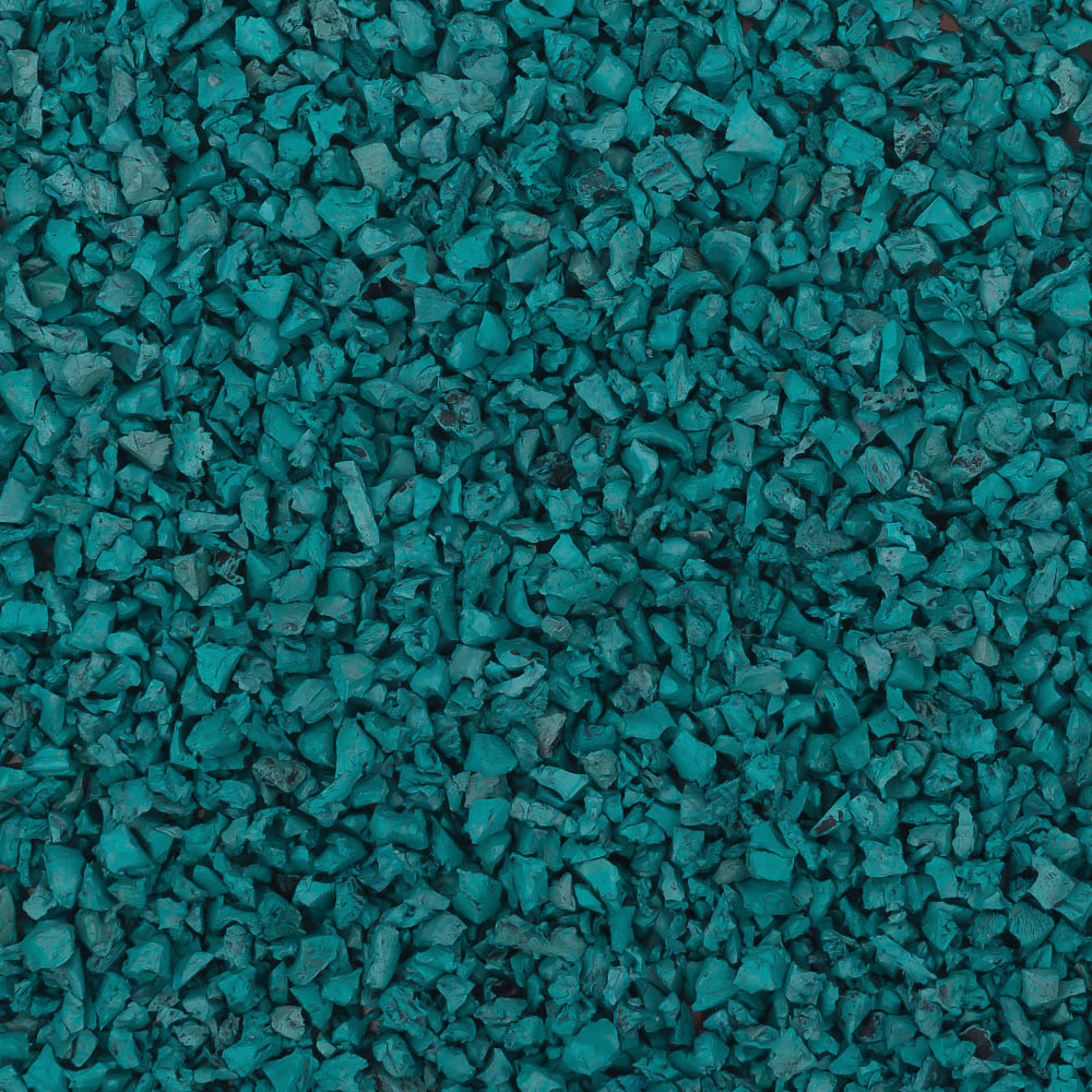 Крашеная крошка цвета морская волна. Получена путем поверхностного окрашивания резиновой черной крошки. Красиво выглядит на детских площадках при создании рисунков морской тематики, а также эффектно сочетается в миксах с желтым цветом.